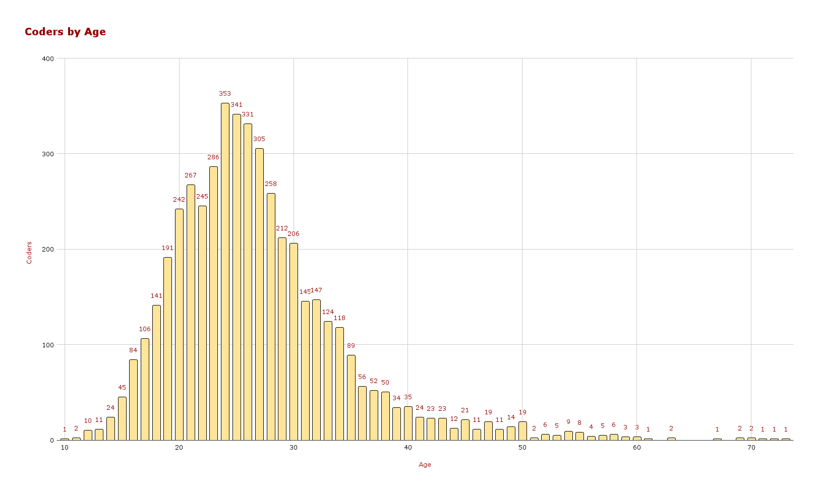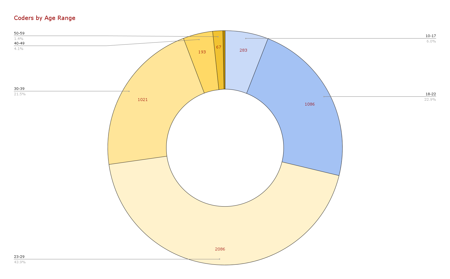 This means that there is a group of nearly equal size who are employed but looking to learn a new skill and perhaps completely change their field of employment. The largest single group who supplied their employment field were in education (173 new coders), followed by food and beverage (118) and arts, entertainment, sports, or media (114). There were also quite a few coders who described themselves as being in sales, office and administrative support, healthcare, finance, and many other fields.